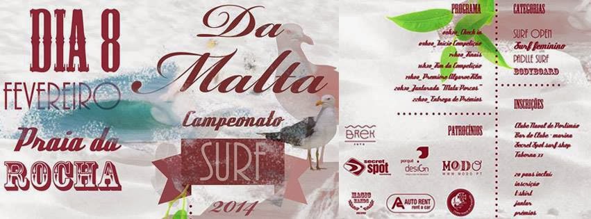 As inscrições para o II Campeonato da Malta podem ser feitas no Clube Naval de Portimão, no Bar do CNPortimão na Praia da Rocha, na Secret Spot surf shop e na Taberna 33 até quinta-feira, 6 de Fevereiro. O campeonato vai ser disputada nos categorias Surf Open, Surf Feminino, Paddle Surf e Bodyboard. As previsões apontam para haver boas ondas no dia da prova. O chefe de juízes será Nuno Sarsfield Magalhães (Juiz FPS Nivel B Nacional Pro).